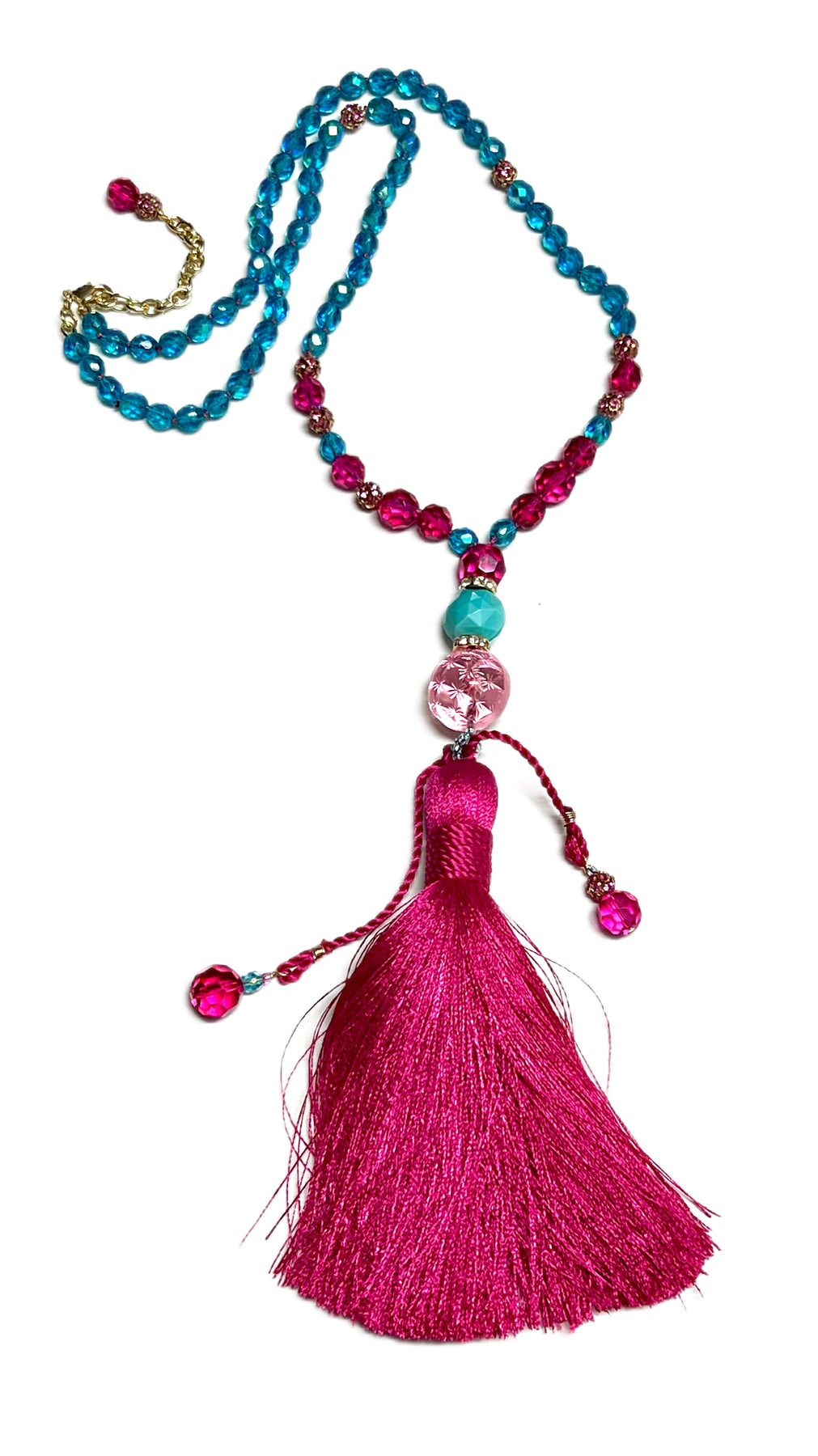 This one of a kind rosary style necklace collar has been made using Czech glass beads and the brilliant pink ones that arrived in a parcel recently from New York .