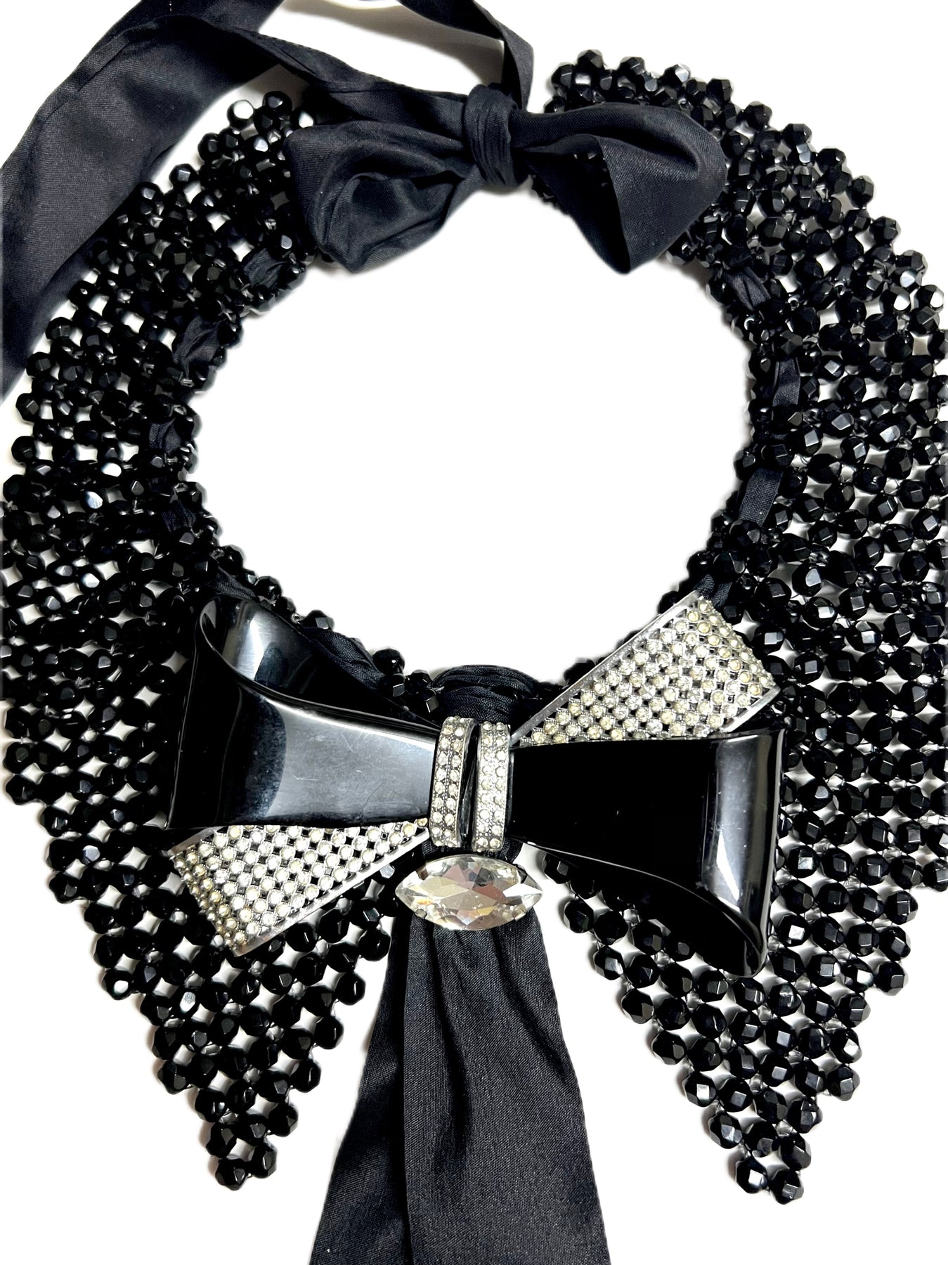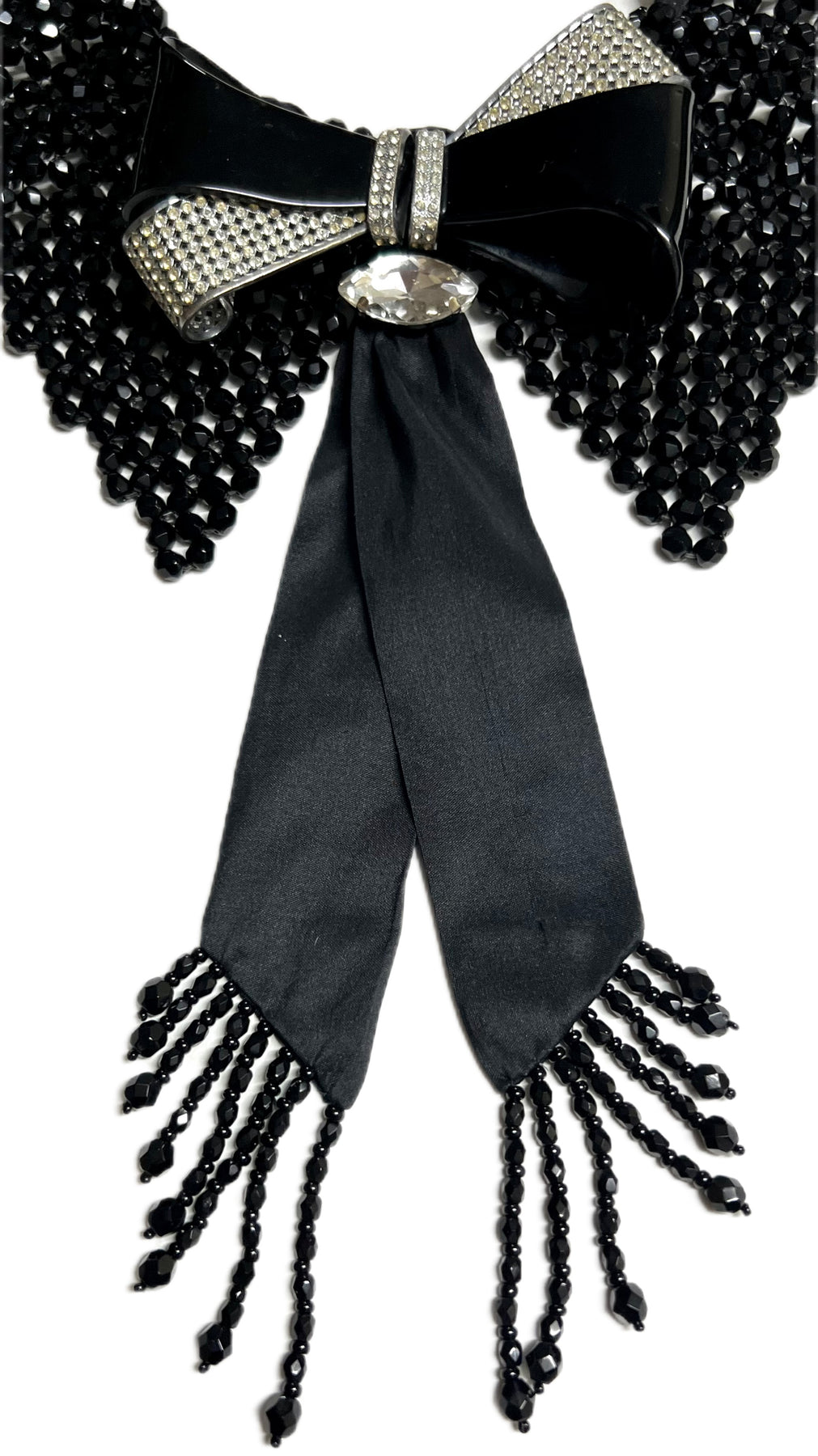 I’ve sewn this Vintage Czech made Bow shaped belt buckle to create a wow centre piece with matching Black Silk beaded ties .